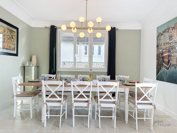 Au rez-de-chaussée vous découvrirez d'abord une vaste pièce à vivre très lumineuse avec une table dînatoire pouvant accueillir 12 personnes